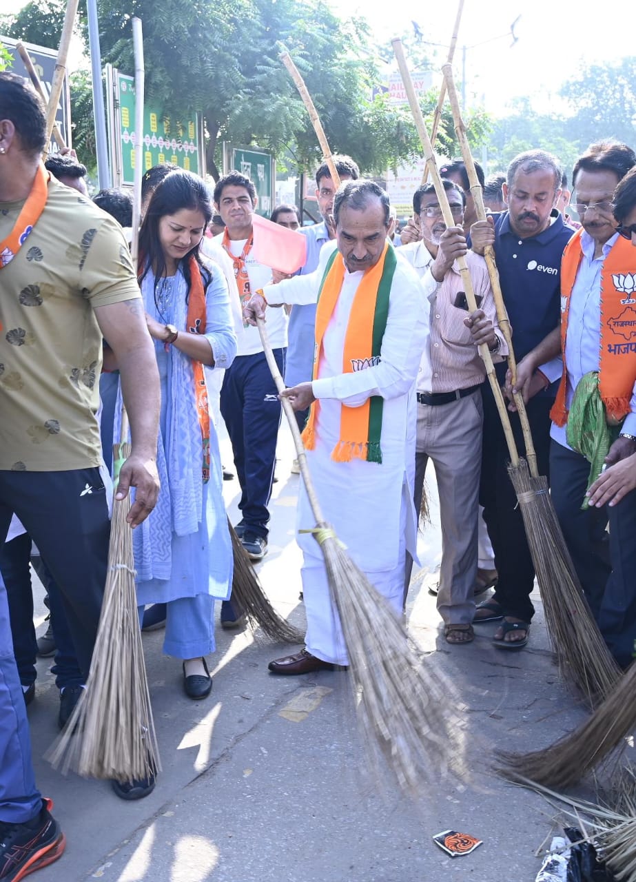 सेवा पखवाड़े के तहत स्वच्छता अभियान में शामिल हुए बीजेपी प्रदेश अध्यक्ष मदन राठौड़, झाडू लगाकर दिया स्वच्छता का संदेश।