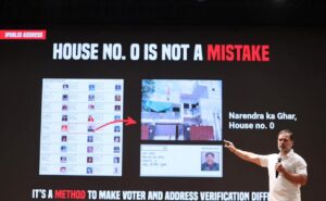 जिनमें लाखों वोट काटे गये , सैकड़ों वोटो में एक ही फोटो का उपयोग कर सैकड़ों वोट बनाऐ गये,हाउस नम्बर 0 के को लेकर चुनाव आयोग ने कुछ महीने पहले कहा था की 0 नम्बर का मतलब होता है की उस मतदाता के पास अपना घर नहीं हे, परन्तु राहुल गांधी ने दावा किया की हरियाणा में जब हमने एक वोटर के 0 नम्बर का क्रोस चेक किया तो उसके पास घर पाया गया।पहले सरकार ने मेरा घर छिना अब सरकार ने इस मतदाता का घर भी छिन लिया है इसके साथ ही नेता प्रतिपक्ष ने आरोप लगाया की एक ही पते पर 10 से अधिक वोटर पंजिकृत मिले जिसका चुनाव आयोग ने वेरिफिकेशन ही नहीं किया जबकि नियम ये कहता है कि की अगर एक ही पते पर 10 से अधिक वोटर हैं तो चुनाव आयोग इसका वेरिफिकेशन करेगा।