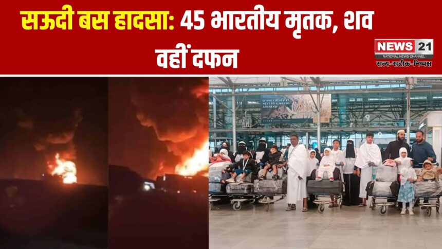 सऊदी अरब के मक्का-मदीना हाईवे पर बस और फ्यूल टैंकर की भिड़ंत में 45 भारतीय नागरिकों की मौत हुई। मृतकों को सऊदी में ही दफनाया जाएगा, मुआवजा प्रक्रिया कठिन।