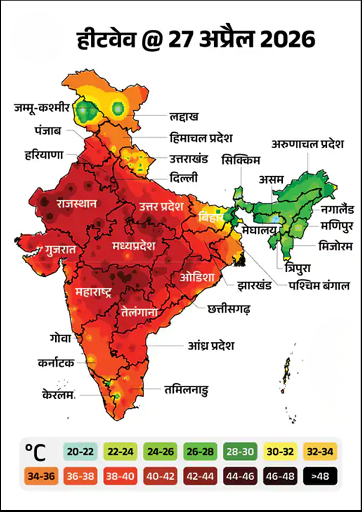 मध्य प्रदेश, राजस्थान, गुजरात, उत्तर प्रदेश, बिहार, छत्तीसगढ़, ओडिशा, हरियाणा, दिल्ली, हिमाचल प्रदेश, पंजाब और महाराष्ट्र में हीटवेव का अलर्ट।