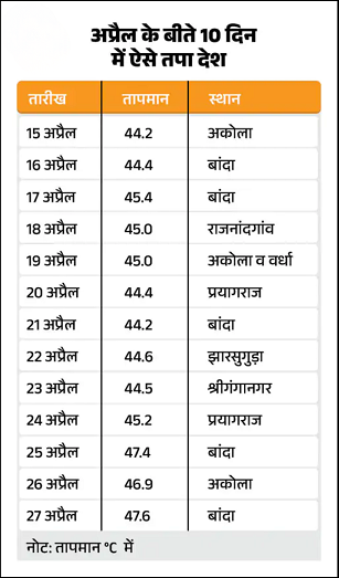 उत्तर प्रदेश और राजस्थान में सोमवार को गर्मी ने सभी रिकॉर्ड तोड़ दिए। बांदा 47.6°C के साथ दुनिया का सबसे गर्म शहर रहा। यहां 30 अप्रैल 2022 और 25 अप्रैल 2026 को 47.4°C तापमान रहा था। सोमवार को राजस्थान के जैसलमेर में 46.4°C तापमान दर्ज हुआ। मध्य प्रदेश के खजुराहो में पारा 46°C पहुंच गया, जो पिछले 10 साल में सबसे ज्यादा है। जैसलमेर-खजुराहो के अलावा देश के 4 शहरों में पारा 46°C या इससे ज्यादा रहा। इनमें बाड़मेर 46°C, वर्धा 46.5°C, अमरावती 46.6°C और अकोला 46.3°C शामिल हैं। बढ़ती गर्मी और हीटवेव को देखते हुए केंद्र ने राज्यों और केंद्र शासित प्रदेशों को सभी अस्पतालों और स्वास्थ्य संस्थानों में हीट स्ट्रोक मैनेजमेंट यूनिट शुरू करने के निर्देश दिए हैं।