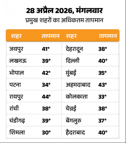 28 अप्रैल 2026 को भारत के मुख्य शहरों का तापमान