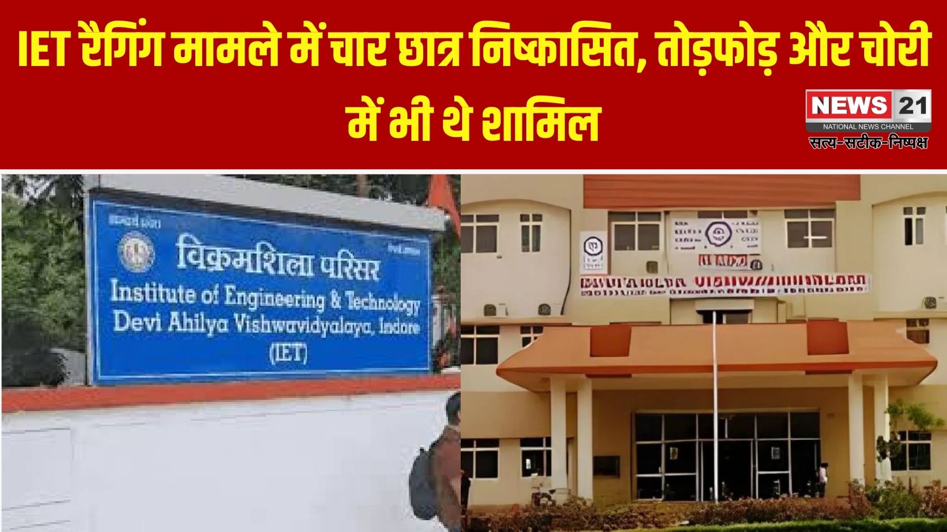 देवी अहिल्या विश्वविद्यालय के अंतर्गत आने वाले इंस्टीट्यूट ऑफ इंजीनियरिंग एंड टेक्नोलॉजी (IET) में रैगिंग मामले में अभूतपूर्व कार्रवाई की गई है। बीटेक प्रथम वर्ष के चार छात्रों को सीधे संस्थान से निष्कासित कर दिया गया है।