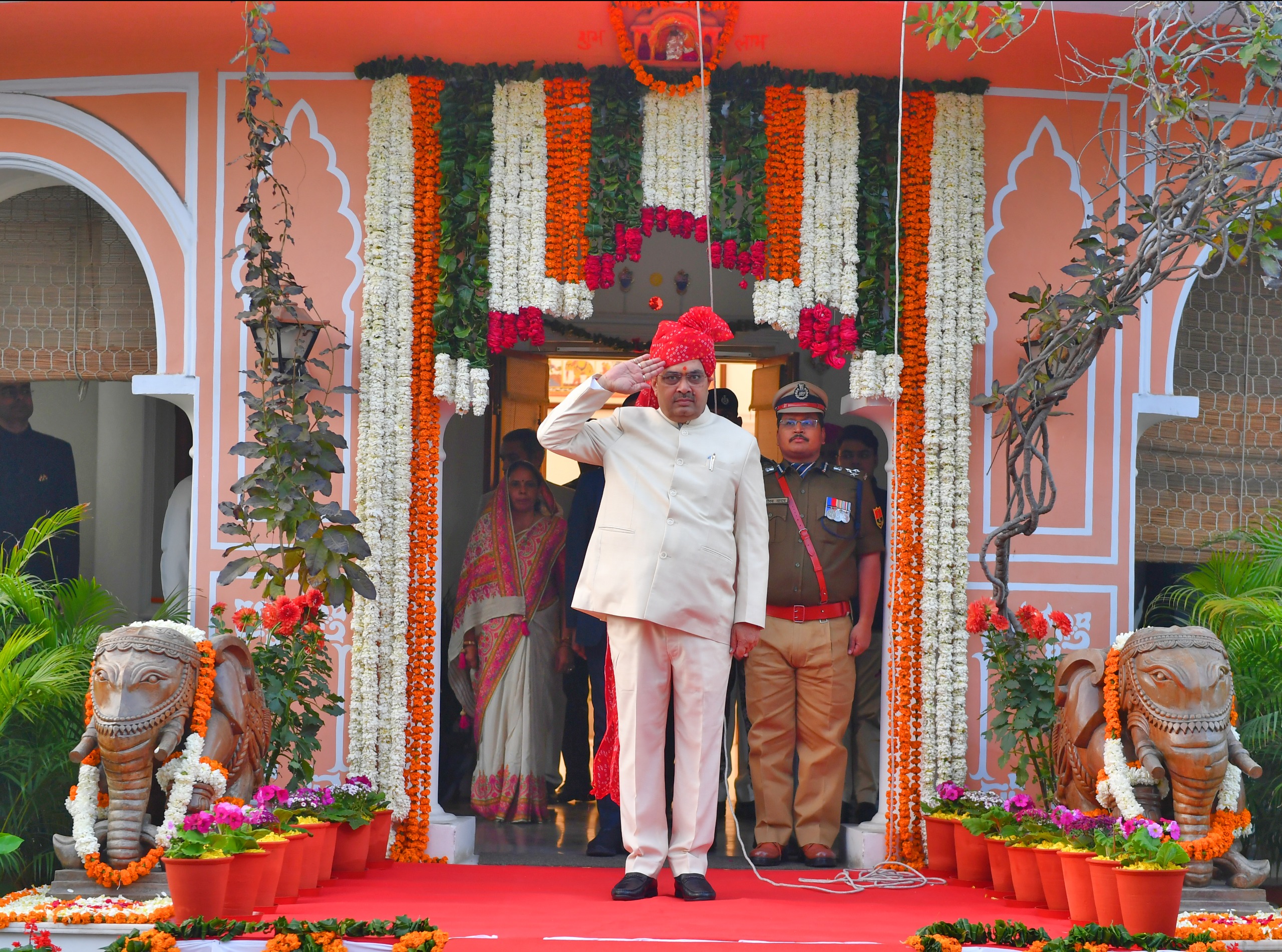 गणतंत्र दिवस कार्यक्रमों की शुरुआत सुबह 7:30 बजे मुख्यमंत्री निवास से हुई, जहां मुख्यमंत्री भजनलाल शर्मा ने ध्वजारोहण किया। इस अवसर पर आर.ए.सी. की टुकड़ी ने कंपनी कमांडर राजेंद्र शर्मा के नेतृत्व में मुख्यमंत्री को सलामी दी। मुख्यमंत्री ने अधिकारियों और कर्मचारियों को गणतंत्र दिवस की शुभकामनाएं देते हुए संविधान के प्रति निष्ठा बनाए रखने का संदेश दिया।