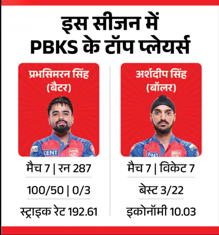 पंजाब किंग्स के लिए इस सीजन में प्रभसिमरन सिंह और अर्शदीप सिंह ने शानदार प्रदर्शन किया है। प्रभसिमरन ने 7 मैचों में 192.61 के तूफानी स्ट्राइक रेट से 287 रन बनाए हैं, जिसमें 3 अर्धशतक शामिल हैं। गेंदबाजी में अर्शदीप सिंह ने 7 मैचों में 7 विकेट झटके हैं।’
