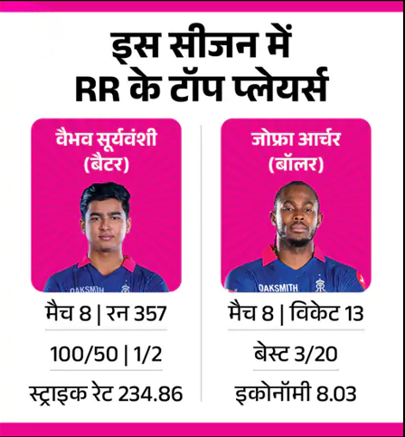राजस्थान रॉयल्स की ओर से वैभव सूर्यवंशी इस सीजन टीम के टॉप स्कोरर हैं। उन्होंने पिछले मैच में हैदराबाद के खिलाफ शतक लगाया था। उन्होंने 8 मैचों में 234.86 के स्ट्राइक रेट से 357 रन बनाए हैं, जिसमें एक शतक और दो अर्धशतक शामिल हैं। बॉलिंग डिपार्टमेंट में जोफ्रा आर्चर कहर बरपा रहे हैं, जिन्होंने 8 मैचों में 13 विकेट लिए हैं।